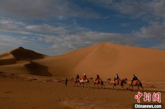 圖為甘肅省敦煌市鳴沙山月牙泉景區(qū)內(nèi),游客沐浴著晨光,欣賞大漠風光,仿佛置身畫卷當中?!垥粤?nbsp;攝
