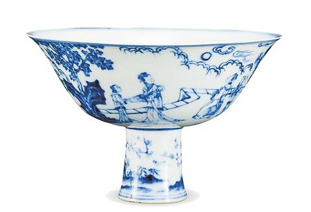 我國自古就有賞月祭月的習(xí)俗,這一習(xí)俗在文物里也有體現(xiàn),湖北省博物館收藏了一件青花瑤臺賞月圖瓷鍾。瓷鍾通高10.1厘米,口徑15.5厘米,足高4.6厘米,足徑4.2厘米,屬官窯出品,白胎,胎質(zhì)細(xì)膩,器壁光亮胎薄,叩之其聲如磬。瓷鍾上繪有“瑤臺賞月圖”,三組人物故事現(xiàn)于瓷鍾外壁:第一組有一老婦人側(cè)身坐在石墩上,身后站一侍女,雙手持扇,老婦對面站一年輕女子,其右側(cè)立一童子。第二組和第三組各有一青年女子和丫環(huán),畫面還有遠山、祥云和花草。“瑤臺賞月圖”紋飾在瓷器界又被稱為“人物紋”,較為罕見,圖中人物共賞天上一輪圓月,與宋人所繪《瑤臺步月圖》一脈相承,意境優(yōu)美,風(fēng)格清新動人。
