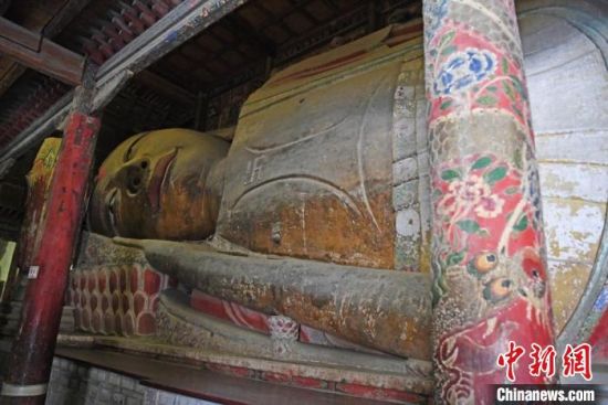 12月中旬,甘肅張掖大佛寺中重要文物的“數(shù)字孿生”打造工作已進入新階段。圖為木胎泥塑臥佛。 楊艷敏 攝