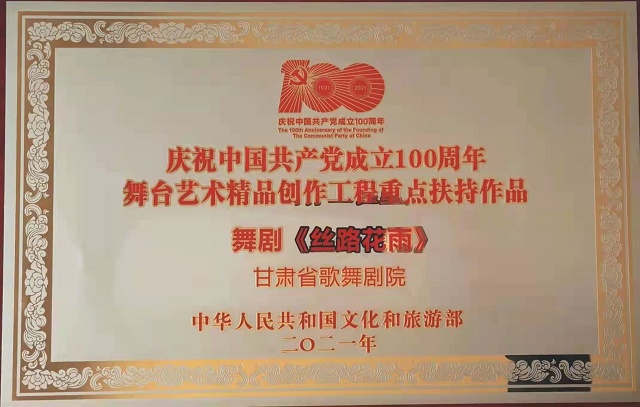 中國甘肅網(wǎng)12月19日訊 12月18日,文化和旅游部在山東省青島市召開的“2021年全國藝術創(chuàng)作工作會議”上,發(fā)布了“慶祝中國共產(chǎn)黨成立100周年舞臺藝術精品創(chuàng)作工程”入選名單,頒發(fā)了“慶祝中國共產(chǎn)黨成立100周年舞臺藝術精品創(chuàng)作工程獎牌”。甘肅省文化和旅游廳遴選推薦的舞劇《絲路花雨》《大夢敦煌》《彩虹之路》、隴劇《官鵝情歌》、小品《你笑起來真好看》等5部舞臺藝術精品,經(jīng)文旅部評審正式入選“舞臺藝術精品創(chuàng)作工程重點扶持作品”。甘肅省歌舞劇院創(chuàng)排的舞劇《絲路花雨》作為12家“百年百部”工程受獎單位在全國藝術創(chuàng)作工作會議上接受獎牌和榮譽證書,甘肅省文旅廳、山東省文旅廳等參會代表12家領獎單位上臺領獎,充分展現(xiàn)了文旅部對甘肅省入選作品質(zhì)量及組織工作的高度肯定。