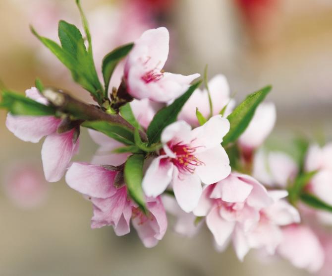 掀起兩層厚重簾子,哇!一片桃花正艷,真是“桃之夭夭灼灼其華”的美景。棚外一片寒冬生命蕭條,沉寂寧?kù)o之靜景,棚內(nèi)卻成仲春生命伸展,嫩葉初展,鮮花綻放的動(dòng)態(tài)。油桃樹最高1.8米,大小相間,形狀各異,枝丫被種植者剪成錯(cuò)落有致,折回分叉,不重疊、透光好的唯美造型。一根根長(zhǎng)短各異的枝條,綴滿了嬌艷的要么正在綻放粉紅色花朵,要么含苞欲放的花蕾。尤其花間那一簇簇一寸來(lái)長(zhǎng)的滴翠綠初葉,更是令人欣慰十足!你要是凝視一棵樹上的某一枝,你就會(huì)被粉紅的笑臉慢慢陶醉,陶醉其鮮嫩從外到內(nèi)紅色由淡到濃的神奇五瓣,其色彩變化,均是自然造就的神來(lái)之筆,每一個(gè)花瓣一如少女翹起的小嘴唇,是那樣的調(diào)皮,如此的逗人!她們聚在一起,訴說(shuō)著那些生命的奧秘!那一簇簇燃燒正紅的花蕊之針,各自頂著一顆顆金黃的珠寶,又在蘊(yùn)含著生命怎樣的走向?……