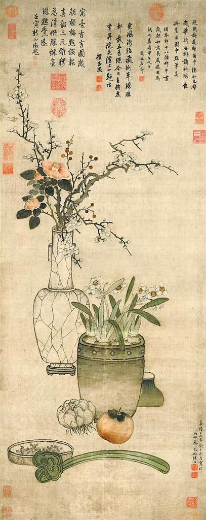 明代陸治的《歲朝圖》可以說是入門級(jí)別的標(biāo)準(zhǔn)范本。白釉冰裂紋貫耳瓶中插梅、茶、天竹,乳釘弦紋盆中植水仙。盆花前是百合、柿子、如意組成的百事如意組合,如意后方的盤中盛穗,又合作歲歲如意。