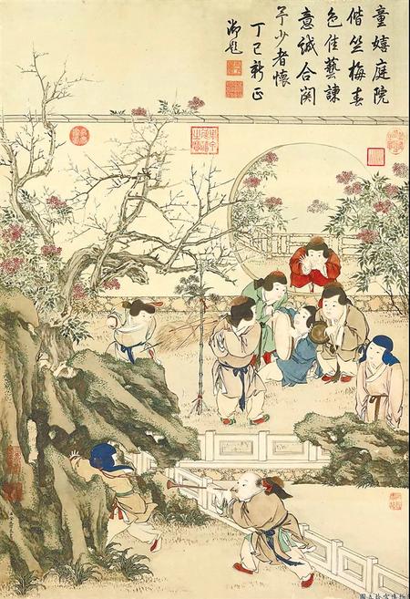 金廷標(biāo)的歲朝圖中,將嬰戲的場(chǎng)景置于種滿梅花和天竹的庭院中,小孩們敲鑼擊鼓吹嗩吶,洋溢著新春的吉慶熱鬧。