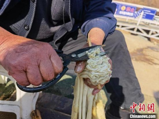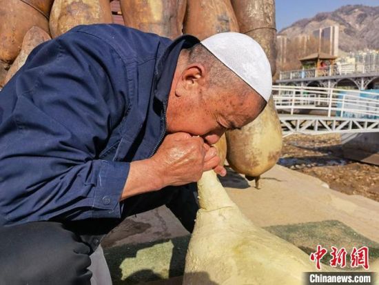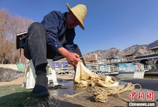 2月24日,春日暖陽(yáng)下,今年70多歲的省級(jí)羊皮筏子非遺傳承人張德寶在蘭州黃河邊制作羊皮筏子,為迎接旅游旺季到來(lái)提前做好準(zhǔn)備。劉玉桃 攝
