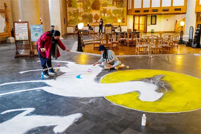 5月8日,母親節(jié),酒泉敦煌市沙文化館以敦煌莫高窟九色鹿壁畫為摹本,以彩色沙為原料,5人團(tuán)隊通力合作,在敦煌鳴沙山下的敦煌山莊大堂“繪制”出長10米寬6米的大型九色鹿沙畫,同時“繪制”了一幅“三兔藻井”沙畫圖案,寓意天下母親“福祿安康”“一路平安”,祝天下母親節(jié)日快樂。
