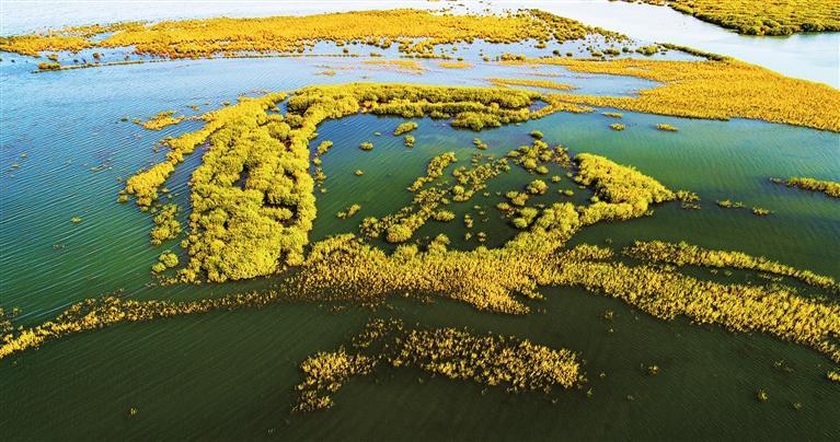進(jìn)入10月,位于武威市民勤縣的亞洲最大沙漠水庫——紅崖山水庫群鳥歡鳴,湖水碧藍(lán)。水柳倒映之下,猶如一朵朵金黃的秋菊盛開。時值水鳥遷徙,大雁、白鷺、赤麻鴨、大天鵝等水鳥或在空中翱翔,或在湖中覓食,金黃金黃的胡楊樹葉閃爍鋪呈,一層又一層光暈,映照出一幅大漠水庫的金秋勝景。