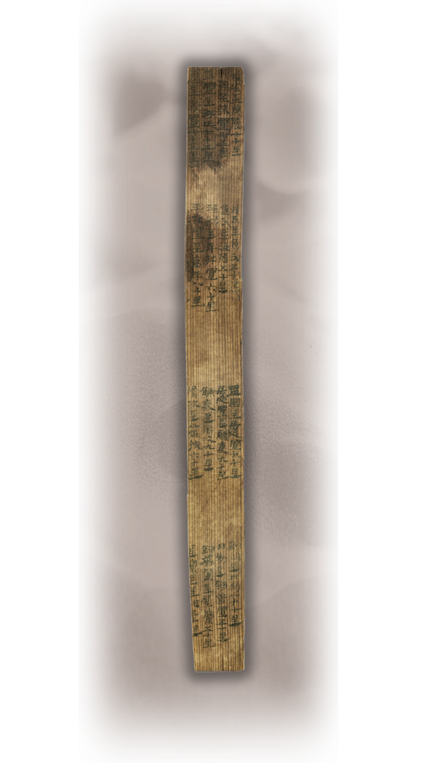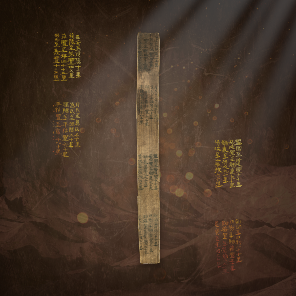 居延里程簡(jiǎn),漢代,國(guó)家一級(jí)文物,發(fā)現(xiàn)于1974年,出土于居延破城子遺址。簡(jiǎn)為松木制作,長(zhǎng)22.9厘米,寬2.1厘米,通簡(jiǎn)從上至下分四欄,每欄從右至左分四行(列)抄寫(xiě),計(jì)17行,地縣驛置名20個(gè)。