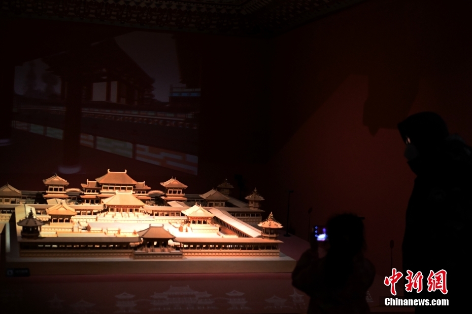 游客正在參觀“千年營造——敦煌壁畫中的建筑之美”特展上出自莫高窟第419窟的火焰券方形龕模型。(中新社記者 李亞龍 攝)