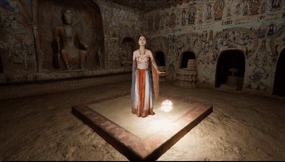 體驗過后,游客還能在虛擬演播廳,實時拍攝一段真人與洞窟虛擬場景交互的視頻。無論身處何處,打開手機便能重溫這段“帶得走”的敦煌記憶。