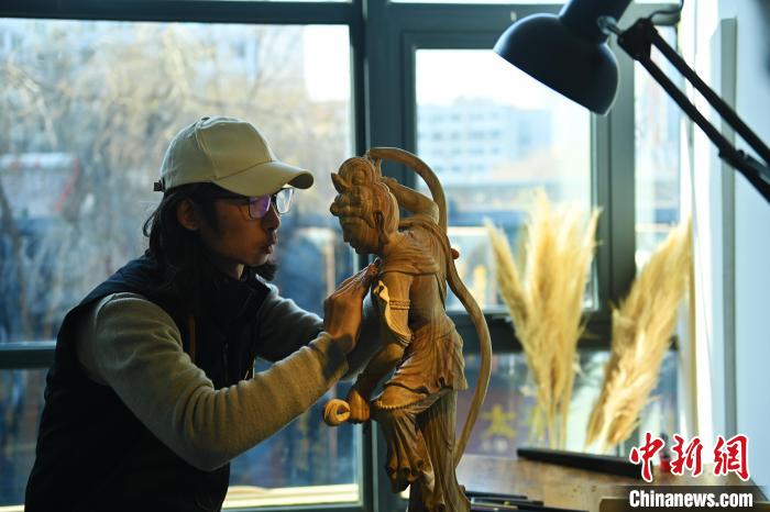1月下旬,在甘肅蘭州技能人才服務(wù)產(chǎn)業(yè)園內(nèi),季茂杰進(jìn)行敦煌元素的木雕創(chuàng)作。李亞龍 攝