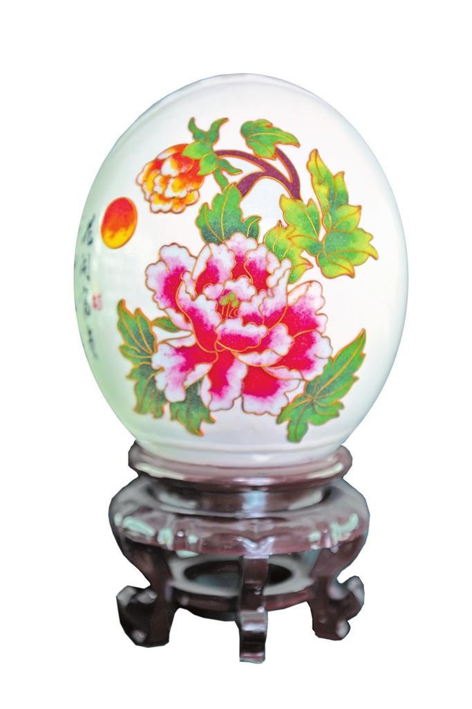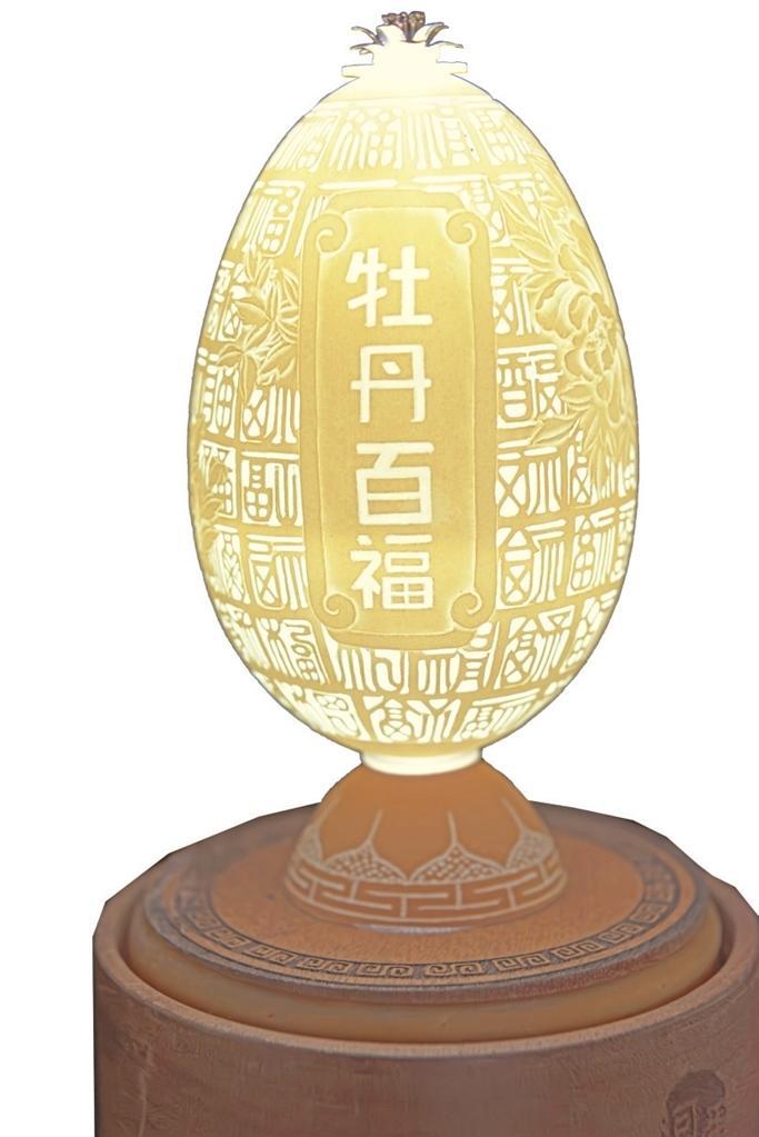 楊星國(guó)雕刻過的作品達(dá)兩千多件,作品《牡丹亭》是他用最新的拼雕手法創(chuàng)作的,鴕鳥蛋殼細(xì)分成300片,打磨成“瓦片”樣,逐片貼成古建筑中亭頂蓋狀,形成牡丹亭之樣,做成外層的“亭”;內(nèi)層的“牡丹”則用鴯鹋蛋殼,利用其自然色,依照牡丹層層雕透,第一層深墨、第二層墨綠、第三層淡綠、第四層白色從外到內(nèi)雕刻,作品既有國(guó)畫的神韻又有雕刻的立體藝術(shù)之美。浮雕、陰雕、陽(yáng)雕、鏤空雕、拼雕等手法,在《牡丹亭》作品里全部顯現(xiàn)。為了讓作品表達(dá)的效果更充分,楊星國(guó)又加了一些機(jī)械原理讓其旋轉(zhuǎn),還加了燈光,于是,3個(gè)鴕鳥蛋殼與1個(gè)鴯鹋蛋殼在楊星國(guó)的巧妙構(gòu)思中有了全新的生命。