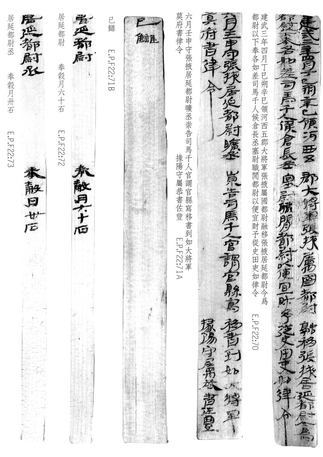 1974年8月出土于甲渠候官遺址第22號房址內(nèi)。簡冊由10枚簡組成,每簡長22.8厘米,前兩簡寬2.5厘米,其余8簡寬1.4厘米。全文200字。內(nèi)容為東漢建武三年(公元25年)竇融統(tǒng)治河西期間留下的一份完整的財政文書。簡文是關(guān)于居延都尉府吏員奉谷標準的通知,由領(lǐng)河西五郡大將軍張掖屬國都尉竇融幕府下發(fā),簡言“如律令”可知其指令具有法律效力。