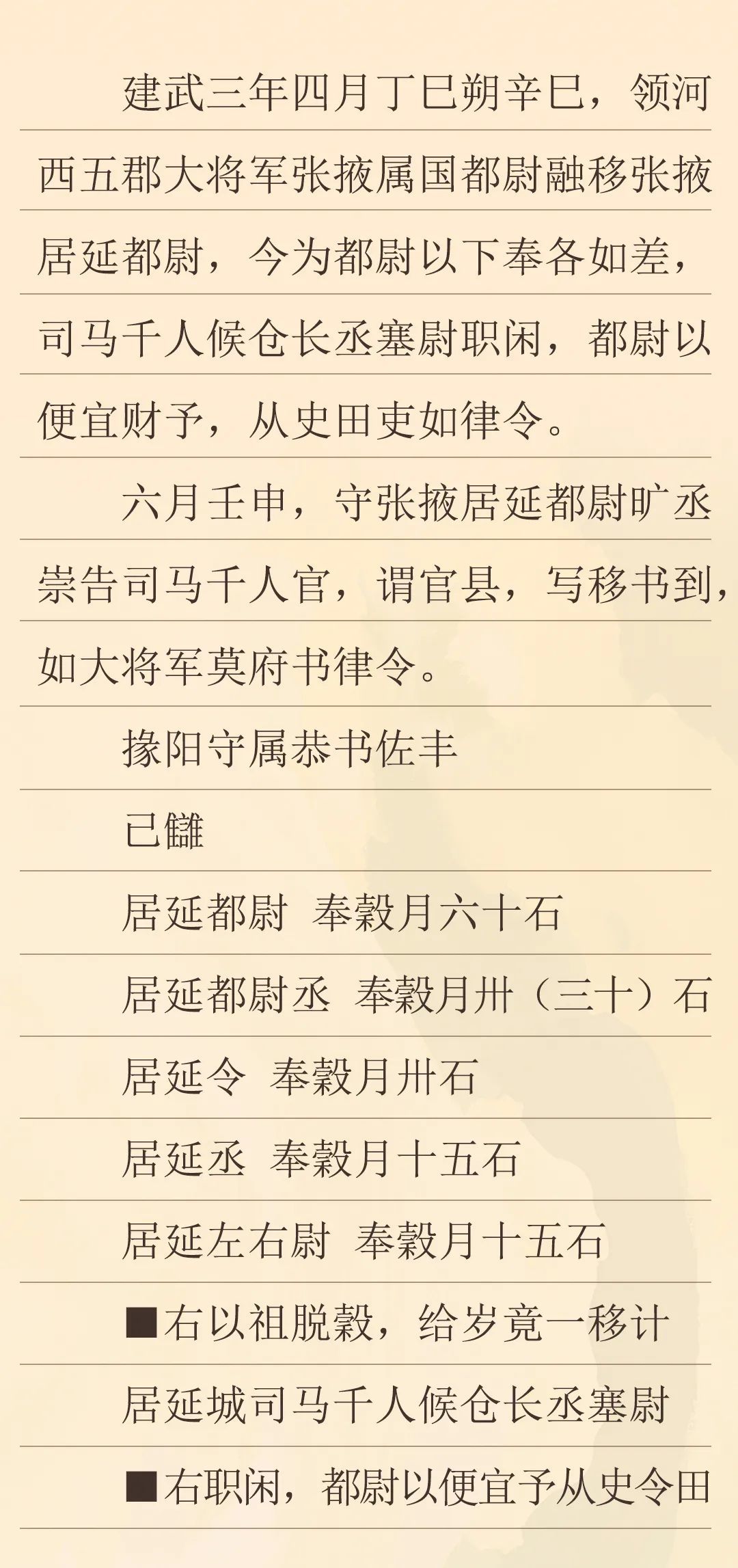 這封冊書記載了建武三年,竇融管轄河西時發(fā)布的一條關(guān)于都尉以下官吏奉谷等差的命令。根據(jù)竇融發(fā)布的新規(guī)定,我們可以看到,秩比二千石的居延都尉月奉谷僅為六十石,史書有“十斗一斛”及“十斗一石”的記載,此六十石即是六十斛,相比于史書記載中比二千石每月百斛的俸例要少,而其余官吏的俸祿也相應(yīng)要少,雖然漢代不同時期的官吏俸祿存在變化,但對比所見的這種情況,可能也跟兩漢之交戰(zhàn)亂頻仍的社會環(huán)境有重要關(guān)系。