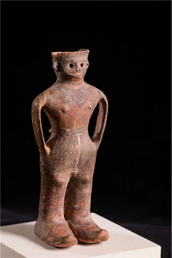 “河西少年”——人形彩陶罐出土于火燒溝遺址,國家一級珍貴文物, 1990年作為甘肅省選送的8件精品文物之一在舉辦第十一屆北京亞運會期間向中外游客展出。遠(yuǎn)看是一名雙手插兜站立的酷少年,其體 態(tài)、動作和神情刻畫得栩栩如生;走近一看,人像短發(fā)、高鼻深目、雙耳開孔、表情生動,其身 著短上衣,頸部至胸前的網(wǎng)格紋就像是戴有精美的項飾,下身著網(wǎng)格長褲裙,雙手插在褲兜里, 碩大的雙腳上穿著肥大的高腰靴子,一副怡然自得的樣子。陶罐人體中空,可以盛水, 插入褲兜的雙臂形成陶罐的雙耳,設(shè)計大膽,制作精巧。2023年玉門市博物館參加的騰訊探元文化創(chuàng)新大賽“古物換新樣”中,“河西少年”成為追捧的對象,在眾多參賽作品中脫穎而出,被很多設(shè)計師設(shè)計成了背包、花盆、臺燈、盲盒等文創(chuàng)產(chǎn)品。