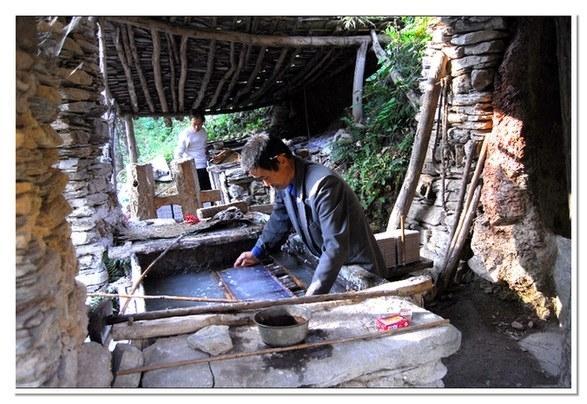 走到山麓,我們看到晶亮的小溪像一條小蛇蜿蜒而來,一個用石頭砌起的水潭上,用幾根木頭支起漁網(wǎng)一樣的物件,水潭上有一間同樣用石頭砌成的操作間,屋頂用石板苫蓋,四周張著篷布遮蔽陽光,這就是傳說中的紙坊嗎?