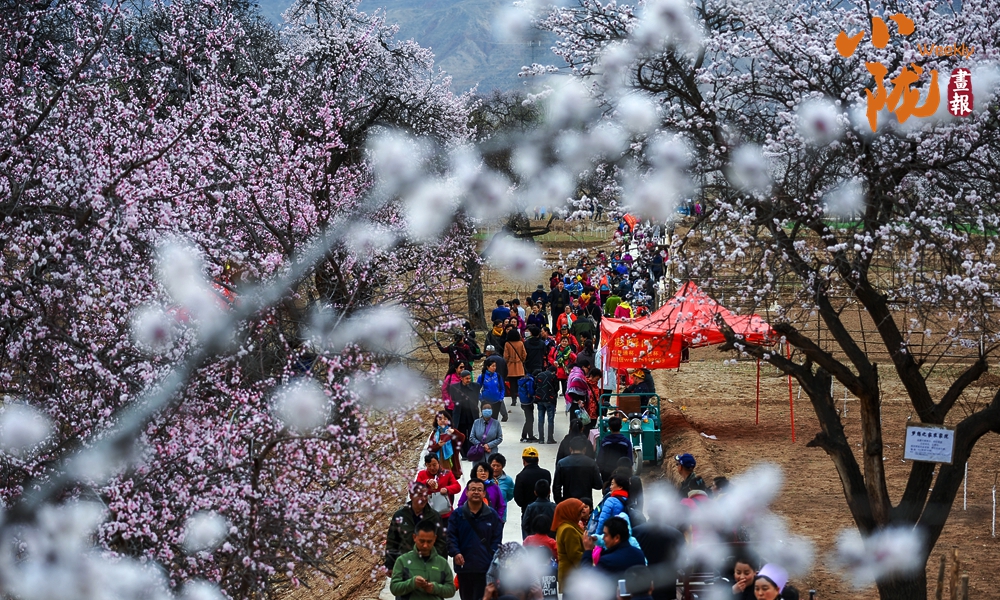 遠(yuǎn)遠(yuǎn)望去,到處是枝節(jié)橫生的杏樹(shù),處處是農(nóng)家小舍,隱藏其中,人在花中,花在眼前。前來(lái)賞花的游客蜂擁而至,在杏園里駐足拍照,流連忘返。