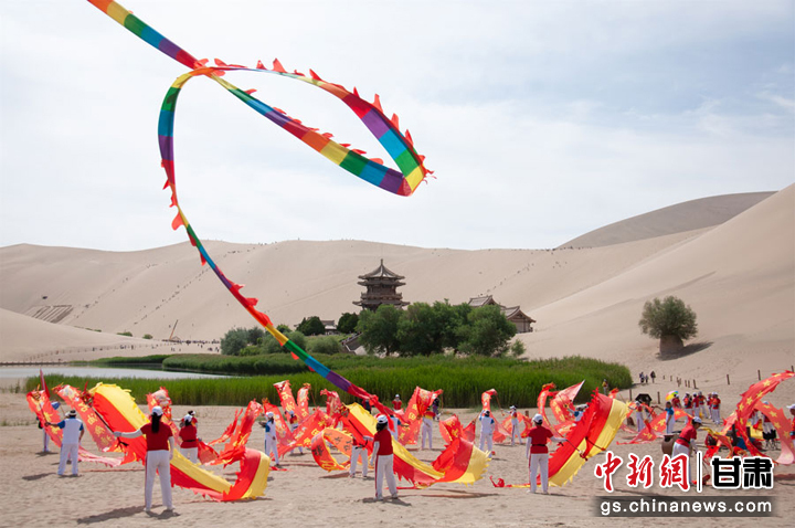 6月10日,敦煌市鳴沙山下,一場以敦煌市舞龍隊為首的20個健身舞蹈隊為廣大市民和游客獻上一臺臺精彩的舞蹈盛宴,吸引了眾多游客圍觀、拍照,在敦煌大漠度過一個難忘的端午節(jié)。王斌銀 攝