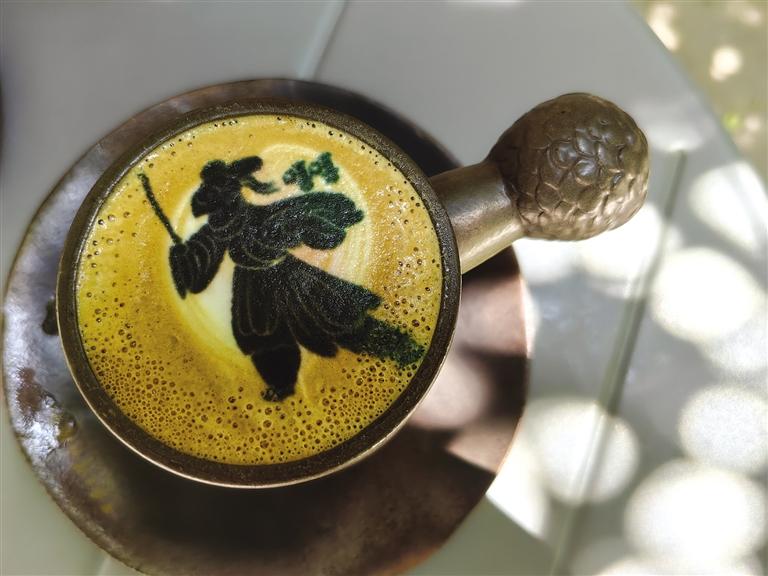 驚喜還有很多,就像店內(nèi)柜體上的一句話“可以讓大家體會(huì)到我們不一樣的用心”,這些年輕人用心起來(lái)還真能撬動(dòng)地球。飲品和咖啡,設(shè)計(jì)團(tuán)隊(duì)愣是把口味和地域文化結(jié)合起來(lái),整出了幾款“限量版”:城市限定——沙橙暴飲品,西北特有;特調(diào)咖啡——苦水玫瑰特調(diào),讓人一口難忘之余還配上了臺(tái)詞,“苦水玫瑰有點(diǎn)甜”;“文物咖啡”更是占據(jù)“C位”,咖啡拉花機(jī)“印制”而成的微縮版銅奔馬、蛙紋罐、銅車馬等文物圖案浮在濃郁的咖啡上,精致、唯美。這還不算,咖啡器皿的名稱也非同尋常——鷹首權(quán)杖杯。陶瓷來(lái)自景德鎮(zhèn),手柄是省博鷹頭形青銅權(quán)杖首的文物原型。驚嘆、贊美、感慨,每一位品嘗之人喜愛(ài)之余竟不忍飲用。