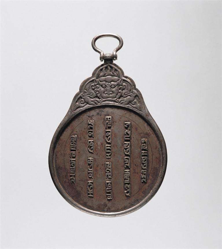 八思巴文虎頭銀符鐵牌,元代,符牌兩面鑲嵌八思巴文銀字,譯為“上天眷命,皇帝聖旨:如不欽奉虔敬,治罪”。廓外上有葉狀鈕座,座內(nèi)鑄虎頭紋,座頂有橢圓形環(huán)鈕。這種虎符圓牌專為傳遞“軍情急務(wù)”而設(shè),持之可進(jìn)出全國(guó)各地及四大汗國(guó),域跨歐亞,故有“國(guó)際通行證”之稱,是研究元代急遞制度以及政治史、民族文字等方面的珍貴實(shí)物資料。這種符牌使用范圍十分嚴(yán)格,故全世界現(xiàn)存數(shù)量極少。