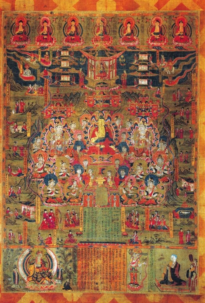 該畫(huà)為絹地設(shè)色,出自敦煌莫高窟藏經(jīng)洞。畫(huà)面中心為說(shuō)法圖,一佛二菩薩法相莊嚴(yán),諸菩薩、弟子、比丘、比丘尼、優(yōu)婆塞、優(yōu)婆夷等“赴會(huì)圣眾”圍繞周?chē)?。兩?cè)及上方分布15幅經(jīng)變故事圖,以連環(huán)畫(huà)形式鋪陳展現(xiàn)《佛說(shuō)父母恩重經(jīng)》的基本內(nèi)容。其上繪七佛、彌勒與七寶,其下墨書(shū)《佛說(shuō)報(bào)父母恩重經(jīng)變》。絹畫(huà)最下方自左向右排布地藏菩薩、《繪佛邈真紀(jì)》、引路菩薩及比丘尼戒行邈真像。該絹畫(huà)保存完整,色彩絢麗,是敦煌《佛說(shuō)父母恩重經(jīng)》諸變相中,內(nèi)容最復(fù)雜,畫(huà)面情節(jié)最多,特點(diǎn)最鮮明,風(fēng)格最獨(dú)特的一幅,且有宋淳化二年(公元991年)明確紀(jì)年,具有重要的歷史、藝術(shù)和研究?jī)r(jià)值。
