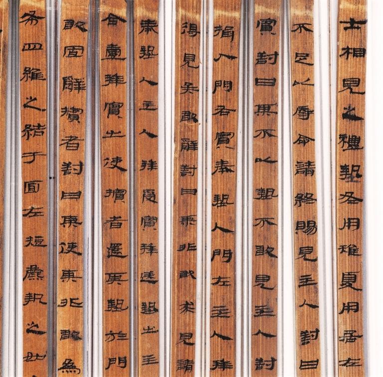 《儀禮》簡(jiǎn),西漢,武威磨嘴子出土。分木質(zhì)和竹質(zhì)兩種,共496枚,編為甲、乙、丙三本,系先編后寫(xiě)。甲本為《儀禮》17篇中的7篇,乙本僅存《服傳》一篇,丙本僅存《喪服》一篇。該簡(jiǎn)冊(cè)保存基本完好,與傳世的鄭玄注本不同,應(yīng)是目前所見(jiàn)《儀禮》的最古寫(xiě)本,在版本??鄙嫌泻芨叩膬r(jià)值,且書(shū)寫(xiě)工整秀麗,是漢代墨寫(xiě)隸書(shū)的上品。