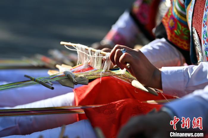 9月26日,甘肅省甘南藏族自治州舟曲縣,當?shù)夭刈鍕D女紡織錦帶吸引游人駐足觀賞。錦帶是舟曲藏族婦女用以束腰、扎靴、攏發(fā)乃至點綴服飾的花帶子,艷麗多彩、圖案優(yōu)美。每逢吉慶節(jié)日,藏族婦女穿戴的華麗盛裝就需要少則五、六條,多則十幾條寬窄長短相宜的錦帶來裝飾。據(jù)介紹,藏族織錦帶技藝歷史悠久,一千多年以前,古羌族和吐蕃已有了較發(fā)達的手工編織技術(shù),在艱難的生活條件下對服飾等生活用品除實用功能之外,已經(jīng)有了強烈的審美追求,是研究舟曲羌藏文化的“活化石”。中新社記者 九美旦增 攝