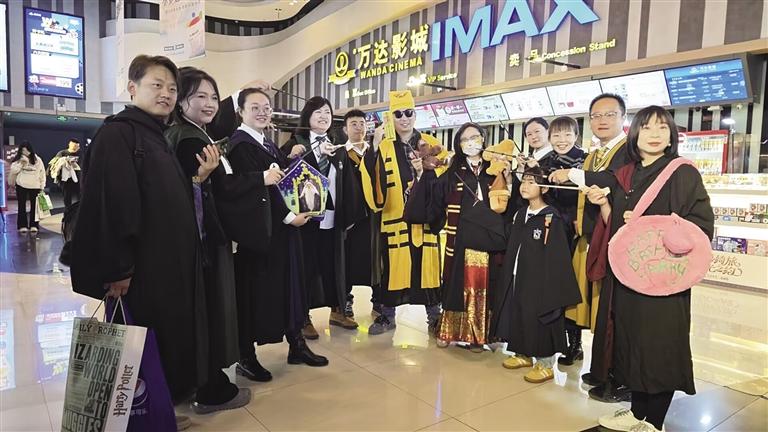“我們小時候一直很向往書中的魔法世界,如今,也想讓孩子感受這部作品帶給我的震撼和感動。”市民李女士帶著8歲的女兒椰子(化名)觀影,第一次走進“魔法世界”,媽媽還為她準備了魔法袍、魔法杖,還有哈利·波特同款眼鏡。