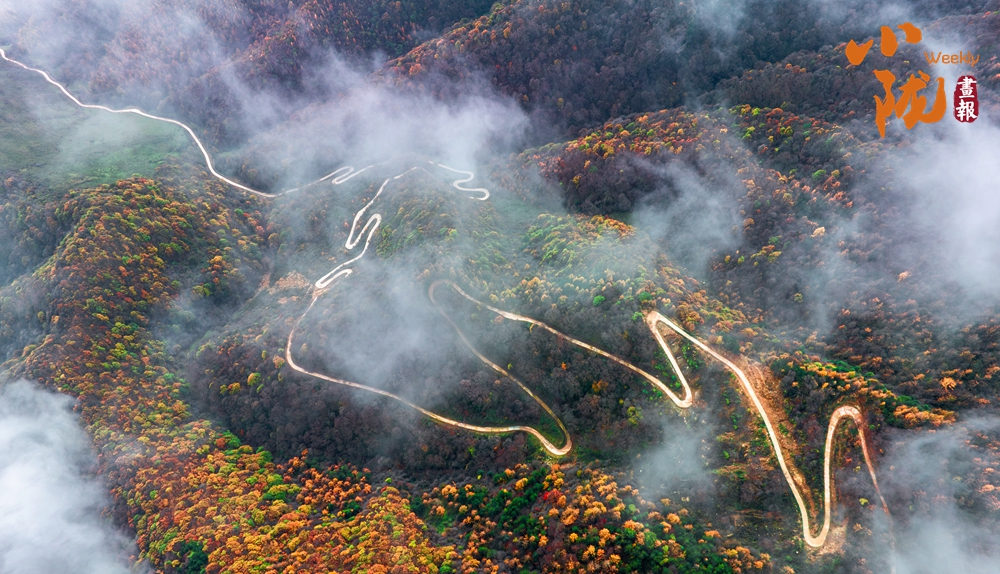 山巒起伏,彩林密集,鋪滿整座山谷。山巔公路宛若玉帶鋪成開來(lái),橫貫蒼茫的林海之上,直通天際。