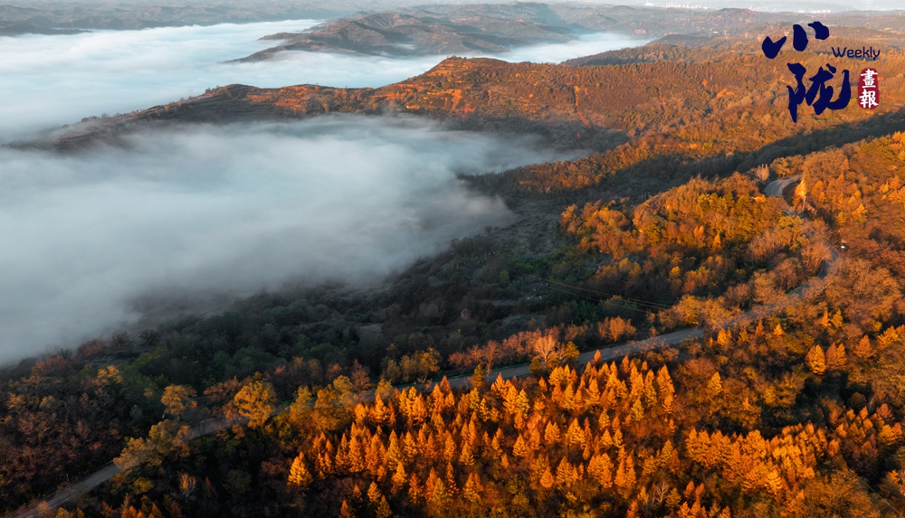 冬日暖陽(yáng)下,大片的林海層林盡染,金黃、橙紅、橘紅等色彩和云霧交織,五彩繽紛、斑斕如畫。