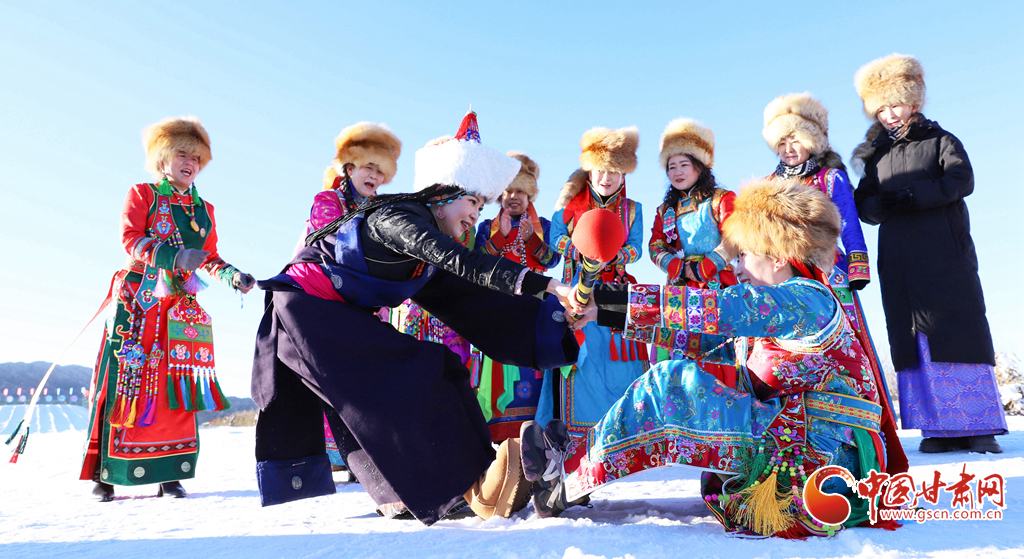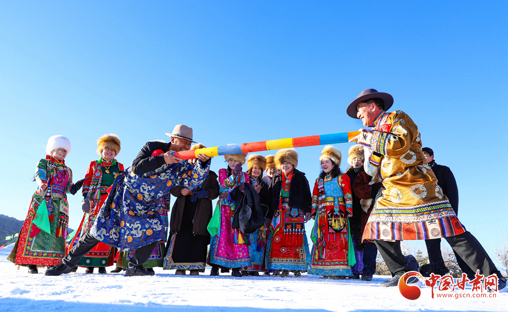當天,來自新疆、內蒙古等地的3000多名游客,和當地藏族、裕固族、蒙古族群眾一起參與了雪地拉爬牛、頂杠子、冰上漂移、摔跤、雪地千人鍋莊舞等冰雪活動和民族特色體育項目,迎接2025新年的到來。