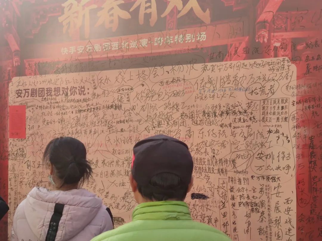 5年后,安萬帶著他的劇團(tuán)來到西安,展板上寫滿了戲迷們對(duì)安萬的祝語。
