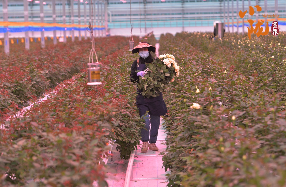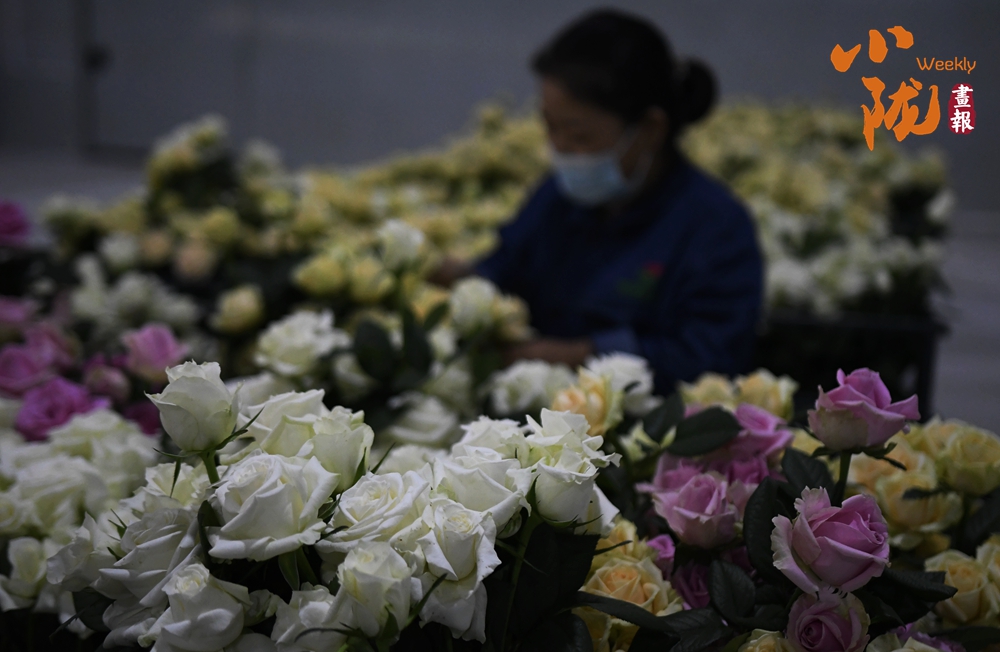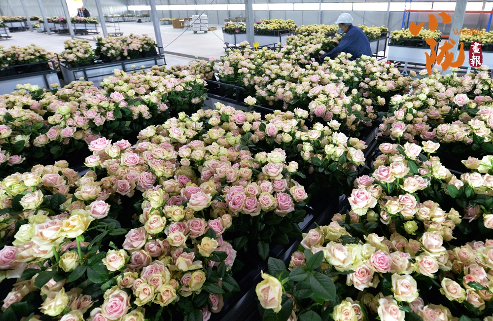 工作人員忙著采摘、分揀、包裝,一束束鮮切玫瑰從這里搭乘冷鏈物流,不僅暢銷國內(nèi),還遠銷海外,成為“一帶一路”上一張靚麗的名片。