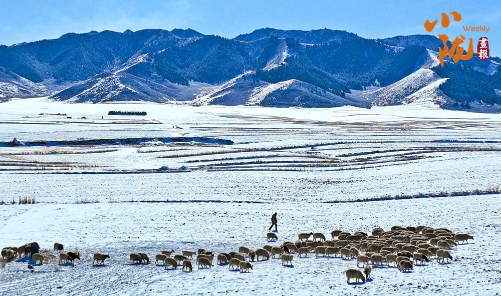 山腳下的牧民人家炊煙裊裊升起,與雪地、羊群、藍天構(gòu)成了一幅和諧共生的春日畫卷。