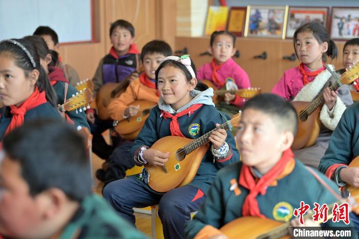 2月26日,甘肅省甘南藏族自治州瑪曲縣寄宿制藏族小學(xué)龍頭琴彈唱社團(tuán)活動,學(xué)生們正在練習(xí)。九美旦增 攝