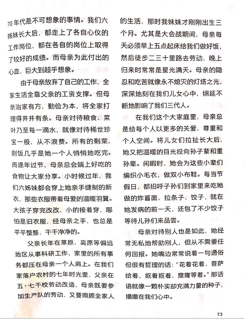 父親長年在草原、高原等偏遠(yuǎn)地區(qū)從事科研工作,家里的所有事務(wù)都壓在母親一個人肩上。在我們家落戶農(nóng)村的七年時光里,父親在五·七干校勞動改造,母親既要參加生產(chǎn)隊(duì)的勞動,又要照顧全家人的生活,那時我妹妹才剛剛出生三個月。尤其是大會戰(zhàn)期間,母親每天必須早上五點(diǎn)起床給我們做好飯,然后徒步二三十里路去勞動,晚上歸來時常常是星光滿天。母親的隱忍和吃苦就像永不熄滅的燈塔之光,深深地刻在我們兒女心中,綿延不斷地影響了我們?nèi)恕?/p>