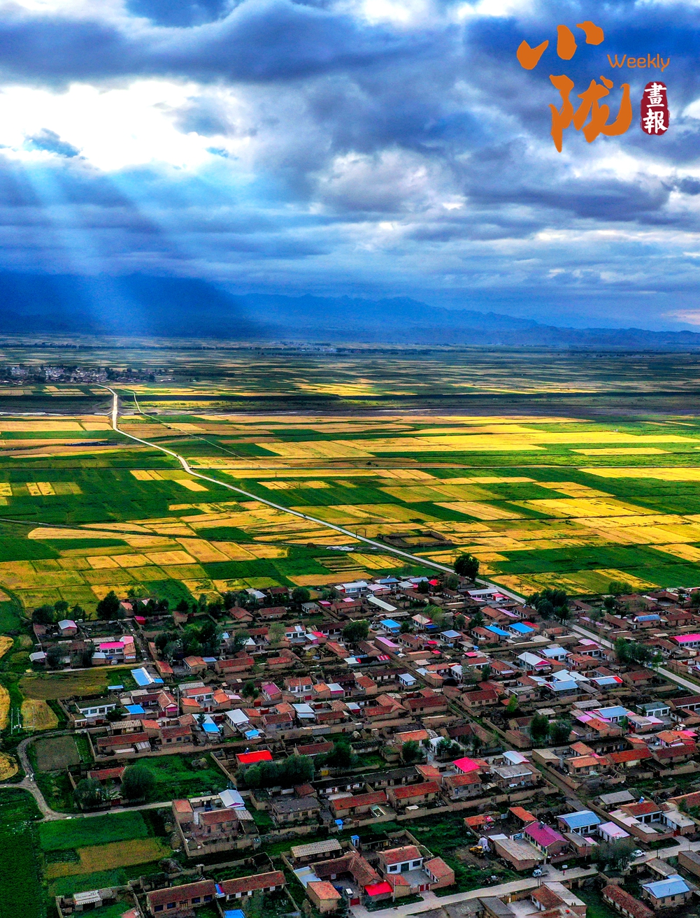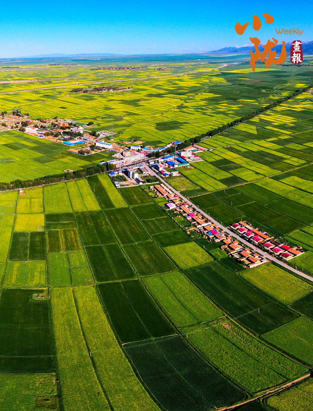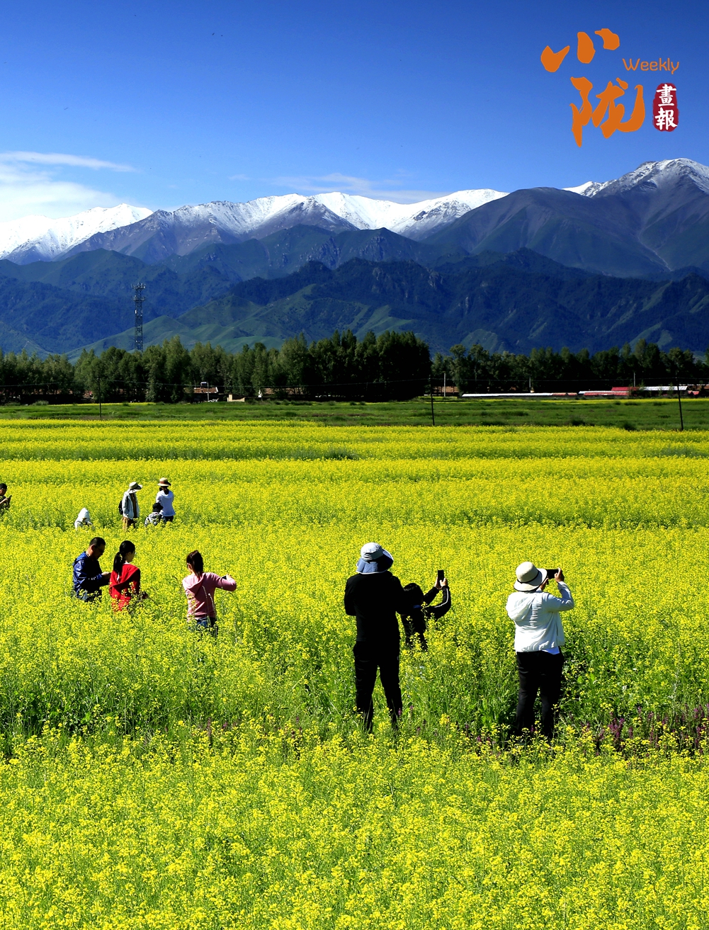 廣袤無(wú)邊的田野生機(jī)盎然,金黃色的油菜花夾雜著一塊塊碧綠色的麥田,好像給大地鋪上了一層五顏六色的大地毯。漂亮的民居鑲嵌其中,與祁連山相互輝映,在陽(yáng)光下美麗極了!