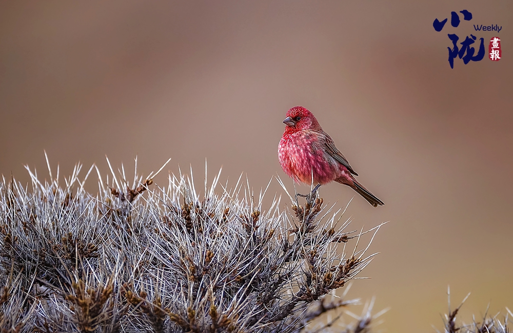 紅眉朱雀,是雀形目燕雀科朱雀屬的鳥類,中等體型,體長約為15厘米。雄鳥的特征是眉紋和臉頰呈淡紫粉色,而上體則有褐色斑駁。雌鳥沒有粉色,難稱“漂亮”,它們?nèi)砘液稚?,?ldquo;朱”一點(diǎn)也不沾邊兒,實(shí)際上,很多鳥類的雌鳥都要比雄鳥暗淡很多,這種暗淡的顏色能幫助它們?cè)诜趼训臅r(shí)候更好地隱蔽,以逃過天敵的捕殺。雄鳥和雌鳥都類似于體型較小的曙紅朱雀。