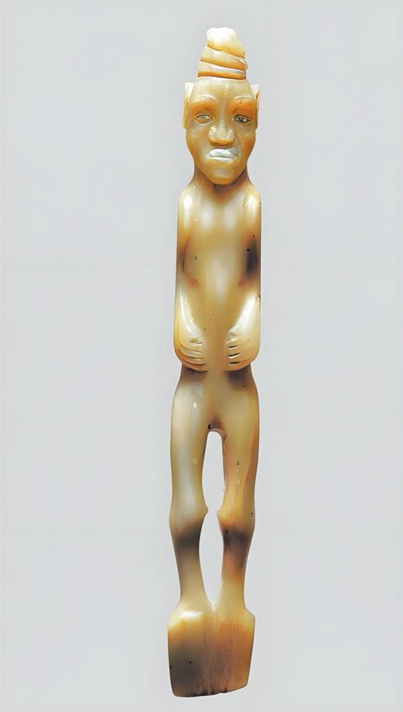 玉人形鏟高17.6厘米,1967年靈臺(tái)縣白草坡M1出土。圓雕工藝,人物裸體站像。發(fā)辮虎首蛇身盤成堆髻。長(zhǎng)臉,闊鼻,深眼窩,大耳,厚唇前突,兩手捧腹,兩腿間呈“8”形鏤空,雙足并攏作鏟形。