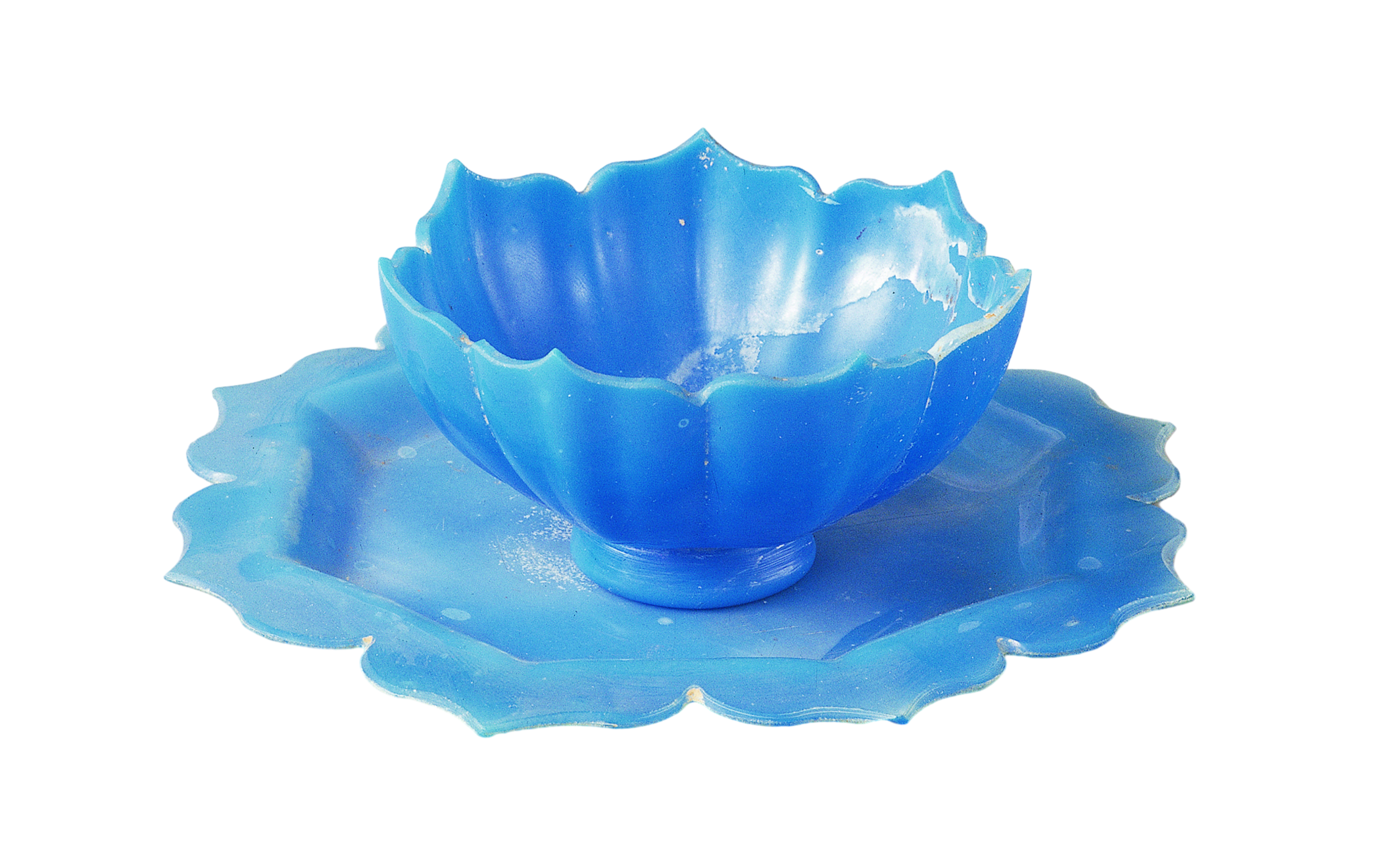 元代 漳縣汪世顯家族墓出土 盞高4.9厘米,口徑8.9厘米,底徑3.4厘米;盞托高1.2厘米,口徑15.2厘米。 玻璃托盞為普藍色玻璃制成,半透明,胎內(nèi)含氣泡。盞為七瓣蓮花形,餅形足;托口為平口,邊沿呈八瓣蓮花形,平底,腹壁呈正八角形。托盞造型優(yōu)美,色彩艷麗,工藝精湛,是迄今出土最完整的一套元代玻璃托盞。