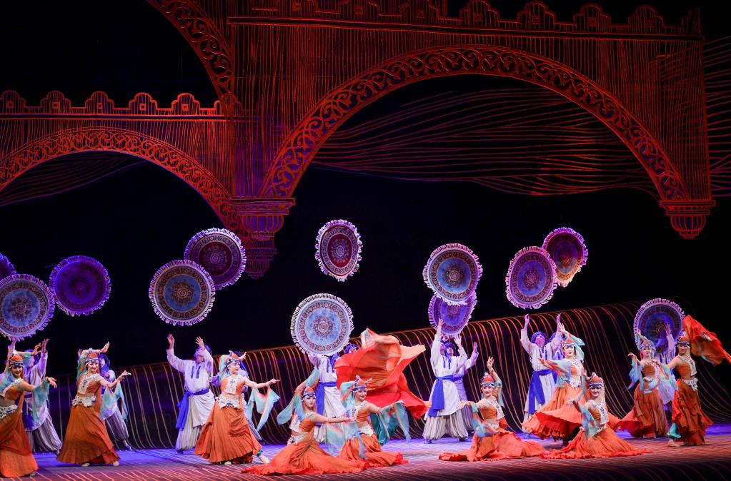 10月27日晚,在烏魯木齊文化中心大劇院,演員在舞劇《張騫》中表演。 10月27日晚,以漢代張騫出使西域?yàn)樗{(lán)本創(chuàng)作的重大歷史題材舞劇《張騫》,在烏魯木齊文化中心大劇院首演。該劇由《授節(jié)》《守節(jié)》《傳節(jié)》《使節(jié)》四幕組成,演繹了張騫出使西域的“鑿空之旅”,展現(xiàn)了各民族廣泛交往、全面交流、深度交融的生動(dòng)場(chǎng)景。 新華社記者 王菲 攝