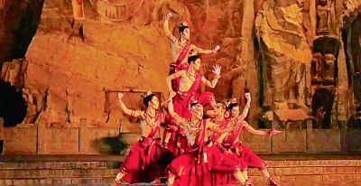 從中華優(yōu)秀傳統(tǒng)文化中尋找藝術(shù)基因和創(chuàng)作靈感的文藝佳作不斷涌現(xiàn),一部部舞臺(tái)表演藝術(shù)作品“破圈”而來,精彩紛呈。河南衛(wèi)視2021年七夕節(jié)制作的《七夕奇妙游》中以龍門石窟石刻圖像飛天和金剛為素材編創(chuàng)的實(shí)景舞蹈《龍門金剛》,就是其中的杰作之一。懷抱樂器的伎樂天從洞窟中飛出,在大佛的注視下翩翩起舞,金剛力士形象逼真、栩栩如生。藝術(shù)家賦予傳統(tǒng)文化遺存跨越歷史的藝術(shù)魅力。古風(fēng)豫韻舞蹈藝術(shù)與龍門石窟悠久的歷史文化相得益彰,將“文化+旅游”的精髓和深意作了深刻的演繹和闡釋。
