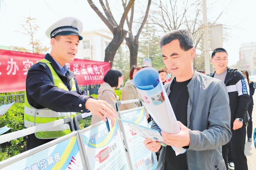 民警給過路群眾發(fā)放宣傳資料。4月8日,鎮(zhèn)原縣公安局交警大隊(duì)開展“春風(fēng)送法暖民心”主題宣傳活動。新甘肅·甘肅法治報記者馬志國攝