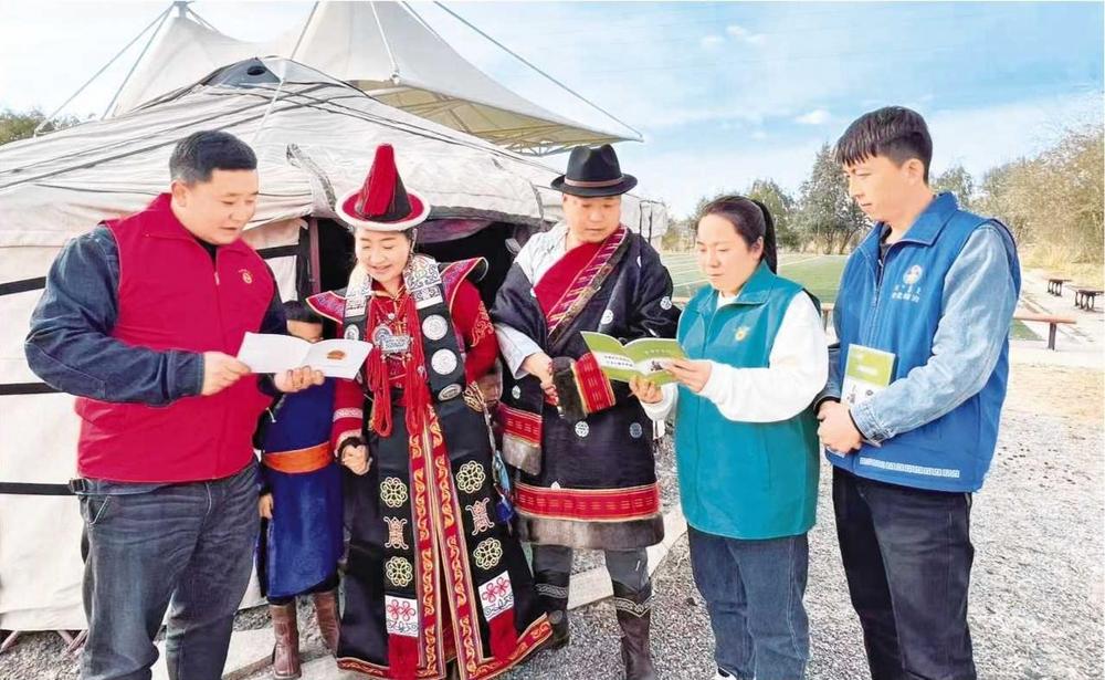 黨城灣鎮(zhèn)綜治中心組織網(wǎng)格員走進(jìn)牧區(qū)開展法治宣傳活動(dòng)(2024年8月20日拍攝)。 肅北縣委政法委供圖