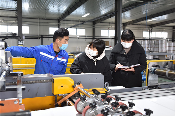 為切實(shí)幫助復(fù)工復(fù)產(chǎn)企業(yè)解決實(shí)際困難,安徽省滁州市南譙區(qū)紀(jì)委監(jiān)委女干部們組成“巾幗服務(wù)隊(duì)”,深入企業(yè)生產(chǎn)加工車間,開(kāi)展調(diào)研走訪,跟進(jìn)督促政策落實(shí)。(安徽省滁州市南譙區(qū)紀(jì)委監(jiān)委 孫煒 攝)