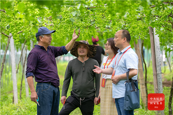 杭州市淳安縣紀檢監(jiān)察干部在富文鄉(xiāng)走訪葡萄種植戶,了解農(nóng)業(yè)產(chǎn)業(yè)扶持政策兌現(xiàn)情況,幫助解決困難,通過精準有效監(jiān)督保障各項惠農(nóng)政策落實。(杭州市淳安縣紀委監(jiān)委 毛勇鋒 攝)