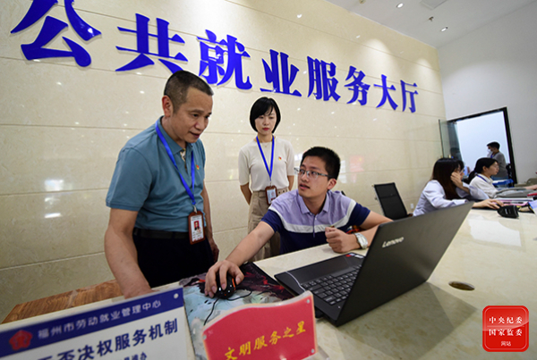 連日來,福建省福州市紀(jì)委監(jiān)委駐市委組織部紀(jì)檢監(jiān)察組深入市人社局下屬單位、有關(guān)企業(yè)調(diào)研督查“穩(wěn)崗就業(yè)”工作推進(jìn)落實(shí)情況。圖為紀(jì)檢監(jiān)察組成員在福州市公共就業(yè)服務(wù)大廳,對相關(guān)工作進(jìn)行調(diào)研監(jiān)督。李德鄰 攝