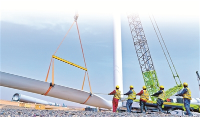 甘肅省高臺縣境內(nèi)有戈壁荒漠2000多平方公里,近年來憑借風光資源優(yōu)勢,發(fā)力新能源產(chǎn)業(yè)賽道。圖為該縣某新能源風力發(fā)電項目建設(shè)現(xiàn)場,工作人員正在安裝風力發(fā)電機。新華社發(fā)