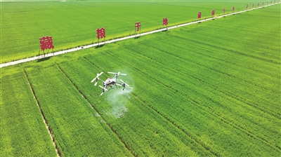 近年來,江蘇省宿遷市宿豫區(qū)多措并舉推動耕地保護責(zé)任落實,加快現(xiàn)代農(nóng)業(yè)產(chǎn)業(yè)園核心區(qū)建設(shè),保障糧食穩(wěn)產(chǎn)增產(chǎn)。圖為近日,在該區(qū)新莊小麥單產(chǎn)提升示范區(qū),無人機正在進行植保噴灑作業(yè)。朱冠軍 攝