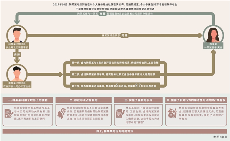 貪污罪。2017年10月,林某某妻子陶某某(無(wú)業(yè),另案處理)考慮到自己以個(gè)人身份繳納社保已滿15年,而按照規(guī)定,個(gè)人參保在55歲才能領(lǐng)取養(yǎng)老金,于是便想掛靠企業(yè)單位參保,以便能在50歲辦理退休、提前享受退休待遇?;诖耍漳衬潮闩c林某某商量能否掛靠B縣農(nóng)業(yè)開發(fā)公司提前辦理退休,林某某聽后表示同意,并利用擔(dān)任該公司董事長(zhǎng)的職務(wù)便利,在明知陶某某不符合提前退休條件的情況下,安排時(shí)任公司辦公室主任李某某(另案處理)虛構(gòu)勞動(dòng)關(guān)系,為陶某某以該公司職工身份辦理退休事宜。手續(xù)辦理過程中,李某某按林某某的安排,偽造B縣農(nóng)業(yè)開發(fā)公司與陶某某的《勞動(dòng)合同書》,經(jīng)林某某本人簽字后加蓋公司合同專用章,陶某某憑該合同在B縣人力資源和社會(huì)保障局進(jìn)行勞動(dòng)合同鑒證。完成鑒證后,陶某某順利以B縣農(nóng)業(yè)開發(fā)公司職工身份參保,當(dāng)年度公司為其繳納職工養(yǎng)老保險(xiǎn)、工傷保險(xiǎn)、失業(yè)保險(xiǎn)、醫(yī)療保險(xiǎn)共計(jì)7649.76元。其間,陶某某從未在B縣農(nóng)業(yè)開發(fā)公司上班,也未向公司補(bǔ)繳為其繳納的社保費(fèi)用。