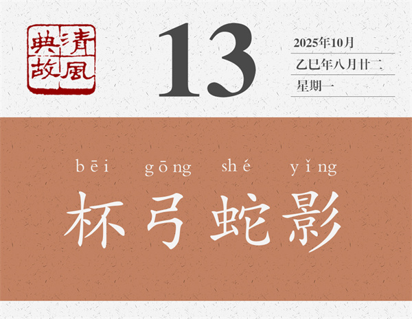 樂廣想,哪有這回事呢?當時,河南聽事堂墻壁上掛著一張弓,上面用漆畫著一條蛇。樂廣就想,這位朋友所見杯中之蛇,是不是這張弓的影子呢?于是,復原了上次喝酒的現場,讓客人坐在原來的位置上,將酒杯放在原來的地方上,問他“酒中復有所見不”,客人說“所見如初”。樂廣這才告訴他,杯中之蛇只是角弓之影而已??腿擞谑?ldquo;豁然意解,沉疴頓愈”。后世即以“杯弓蛇影”為典,比喻疑神疑鬼,自相驚擾。明人袁宏道詩《病中和黃道元至日禪寺夢悉詩》:“消愁莫問弓蛇影,對境聊觀夢幻身。”